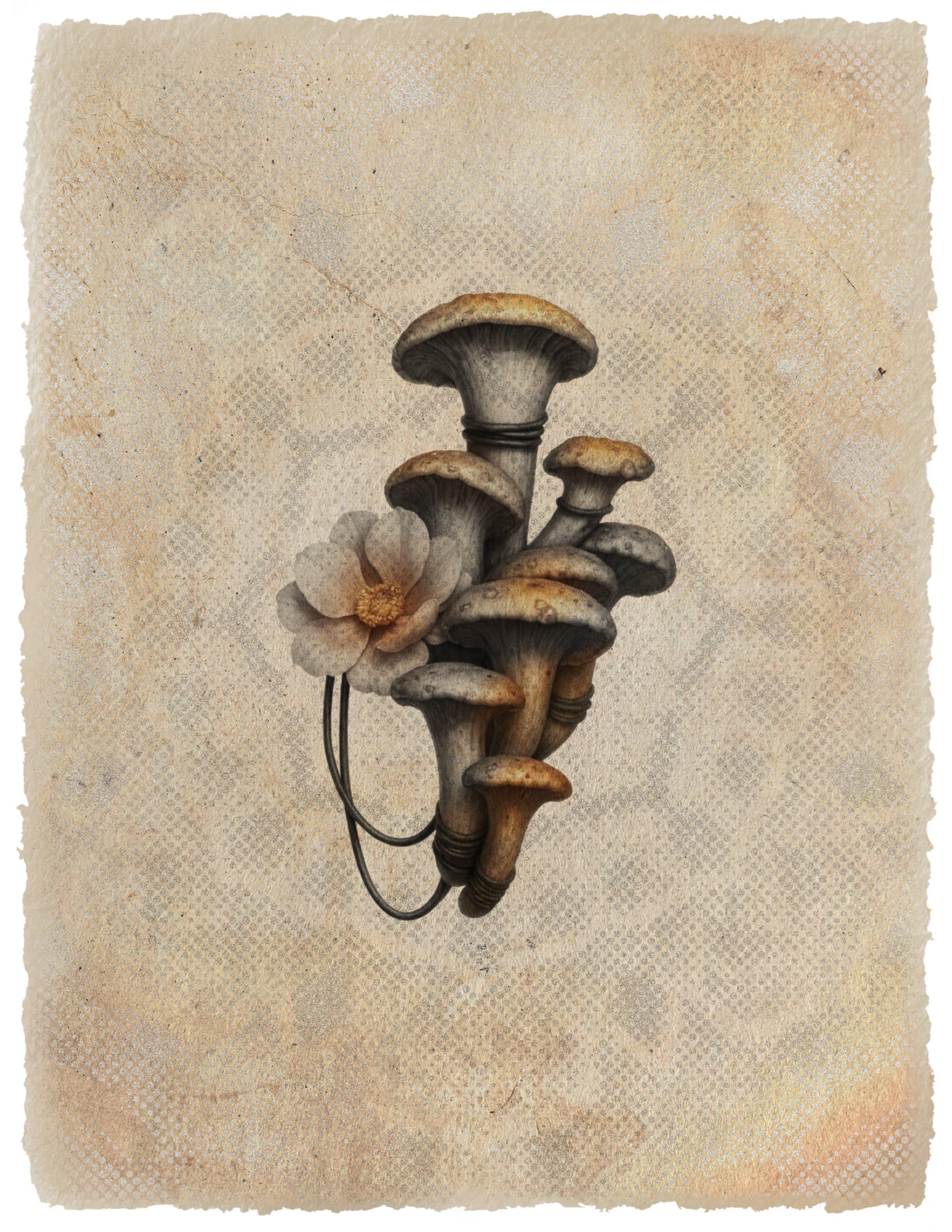 Mushroom Bloom | Micro-realistic mushroom cluster with a soft floral accent. Works well on outer arm or calf. | $900