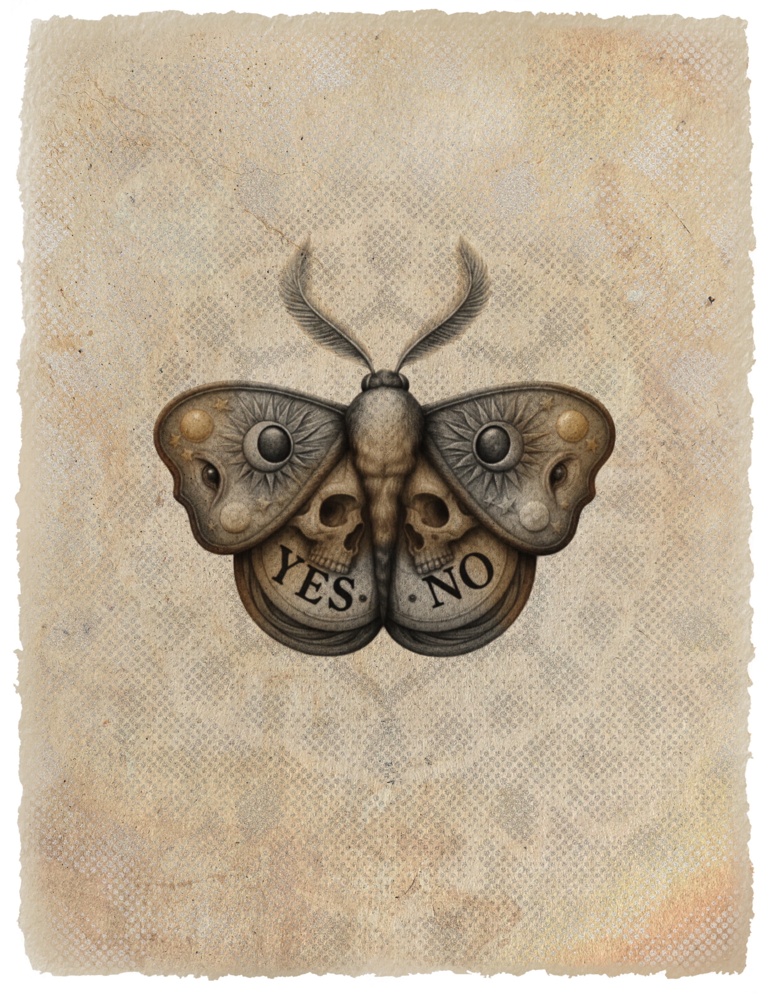 Oracle Moth | A skully moth with ouija wings, drawn with tight shading and balance. Great for forearm or upper arm. | $1200