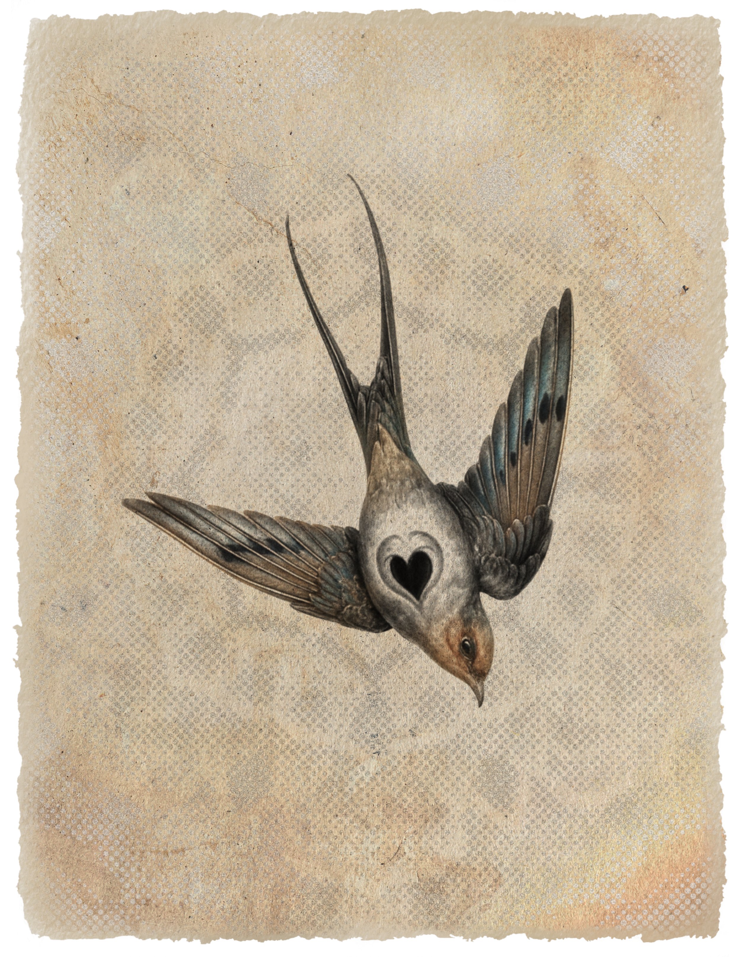 Hollow Songbird | A stylized songbird with a clean heart cutout, illustrated in fine micro-realism detail. Works well on arm, ribs, or back. | $1000